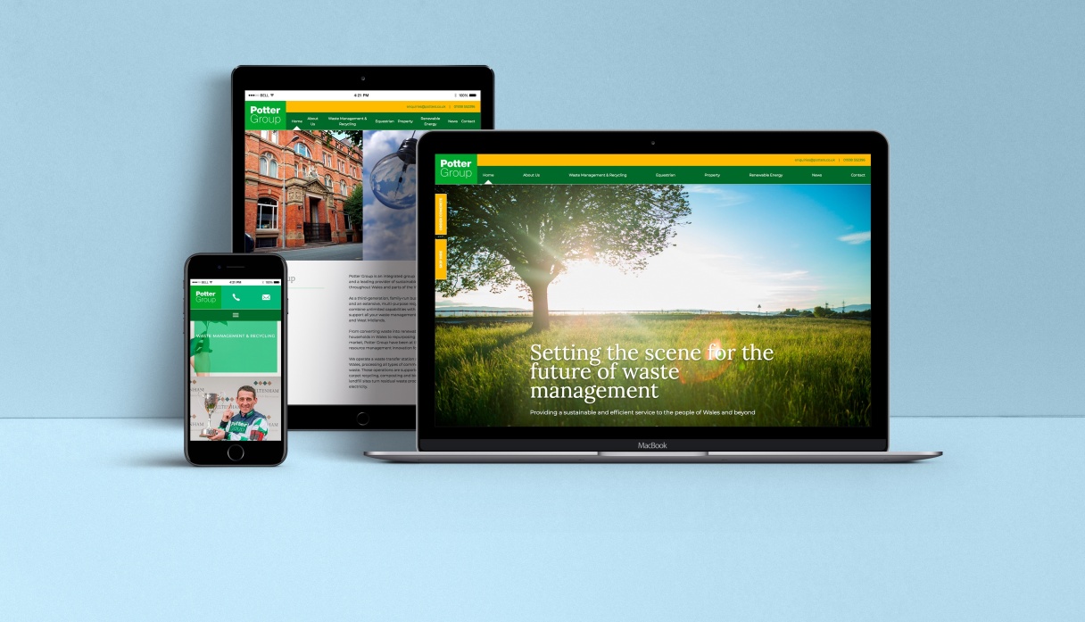 Potter Group are the largest independent waste management company in Wales. When the Group relocated to new headquarters, its buildings were tastefully updated with modern design and contemporary furniture. Potters already had a distinctive brand which was widely recognisable throughout Wales, so we worked with this to create new signage throughout their premises. We also redesigned their website to unite the Group’s various operations into one consistent, accessible online platform.